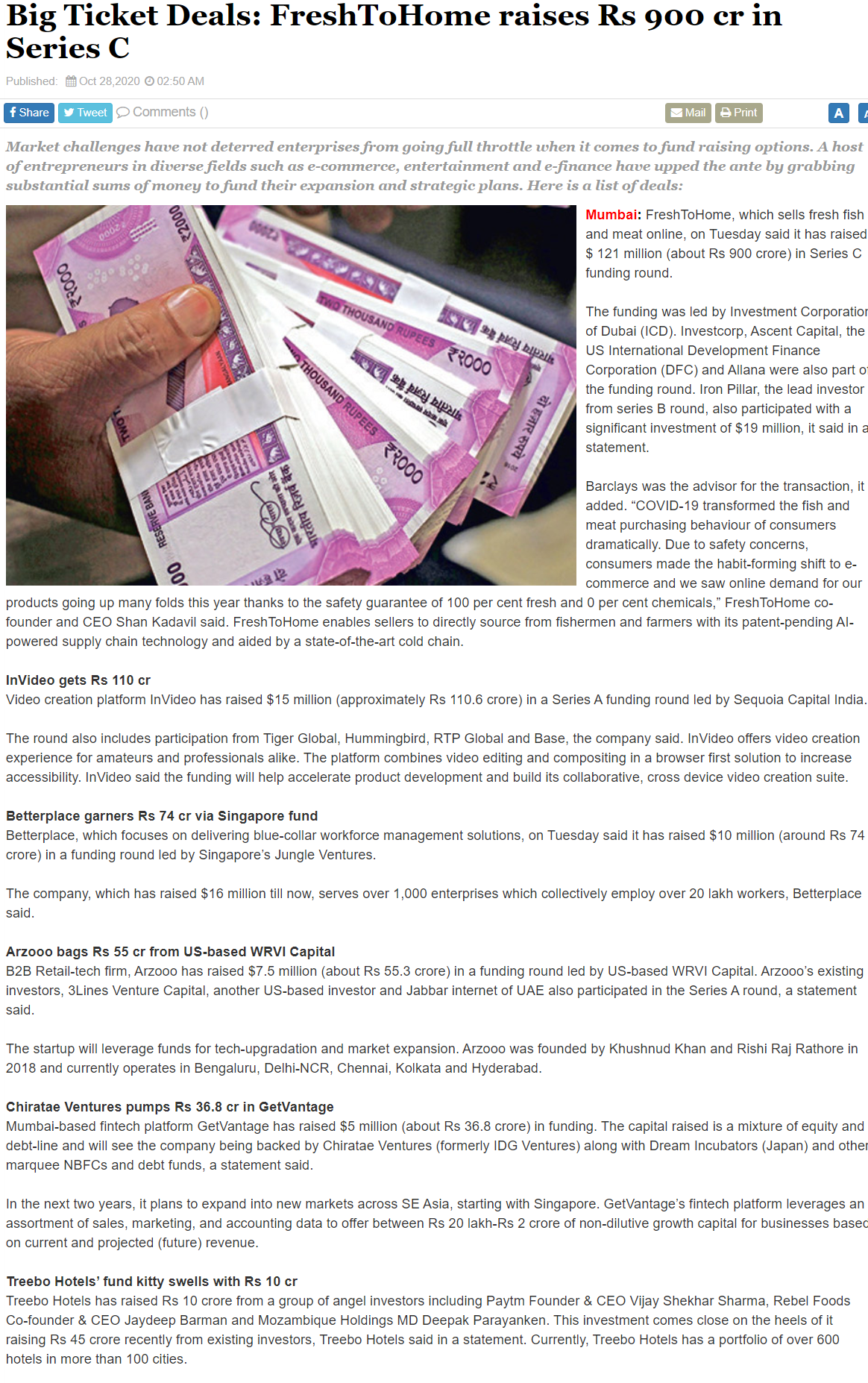 October 28, 2020 By Supriya Ghorpade News Big Ticket Deals: FreshToHome raises Rs 900 cr in Series C- DT Next Supriya Ghorpade October 28, 2020 source Related
