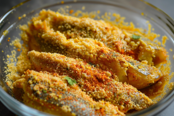 After the fish has marinated, dredge it in the rava (semolina). Make sure each piece is evenly coated for maximum crunch.