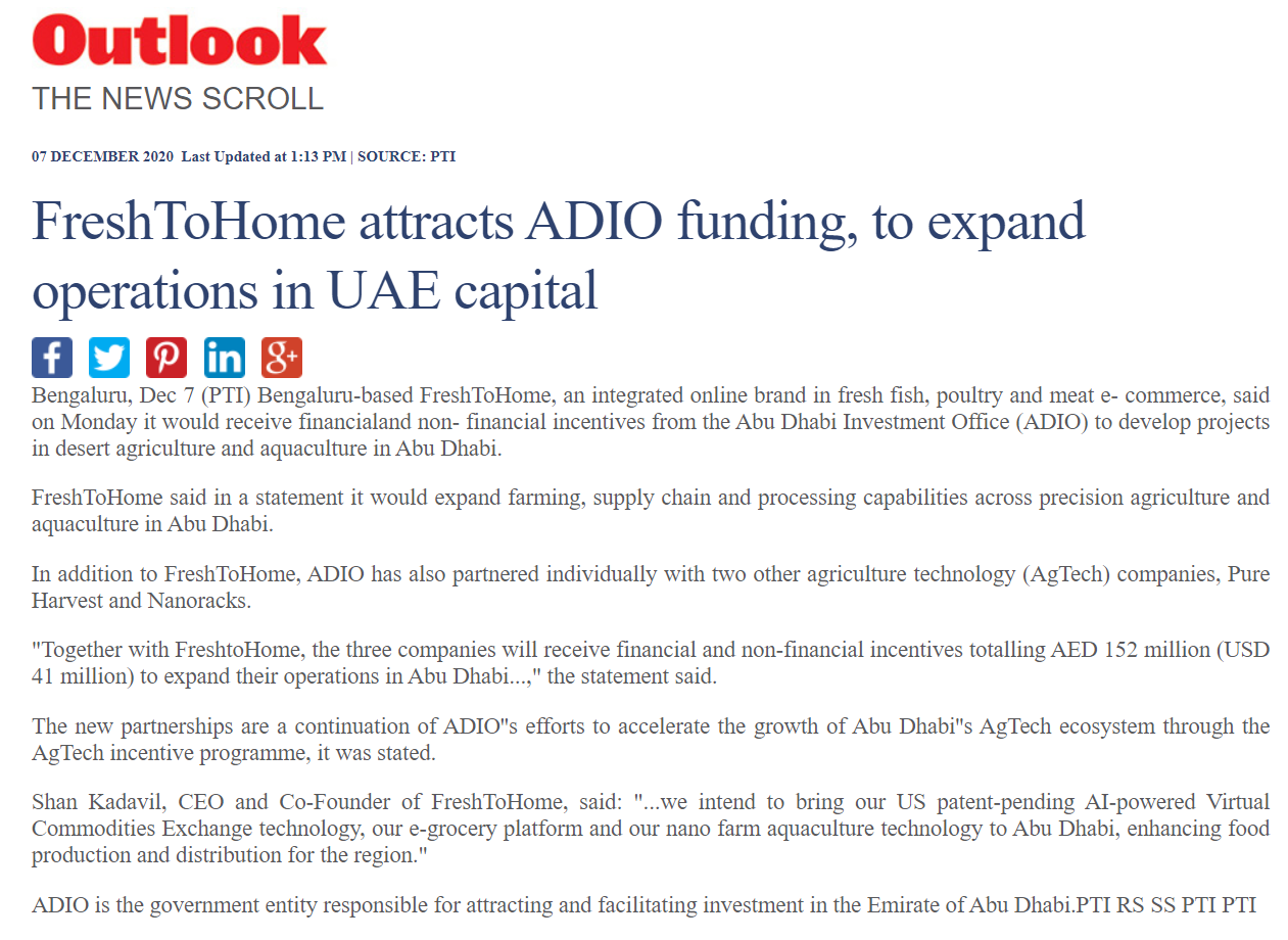 December 9, 2020 By Supriya Ghorpade News FreshToHome attracts ADIO funding, to expand operations in UAE capital- Outlook India Supriya Ghorpade December 9, 2020 source Related
