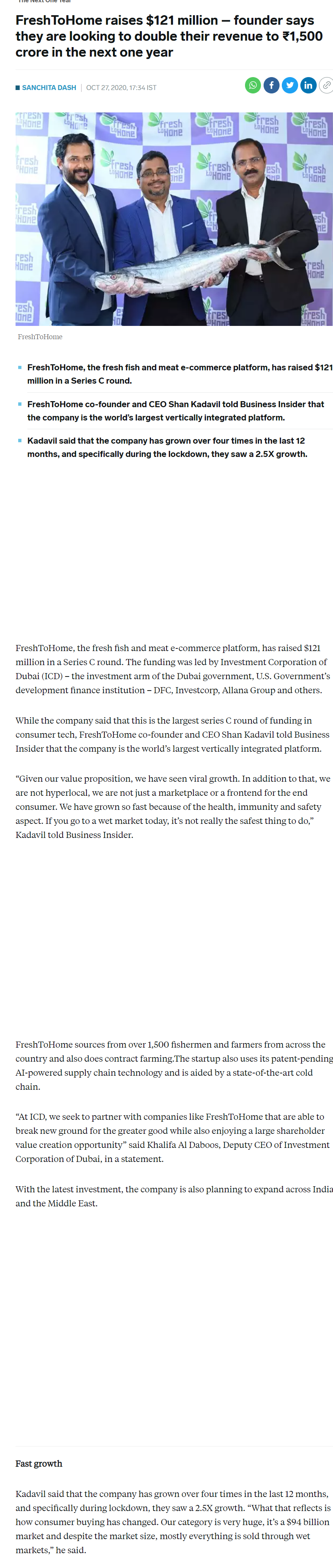 November 13, 2020 By Supriya Ghorpade News FreshToHome raises $121 million – founder says they are looking to double their revenue to ₹1,500 crore in the next one year Supriya Ghorpade November 13, 2020 source Related