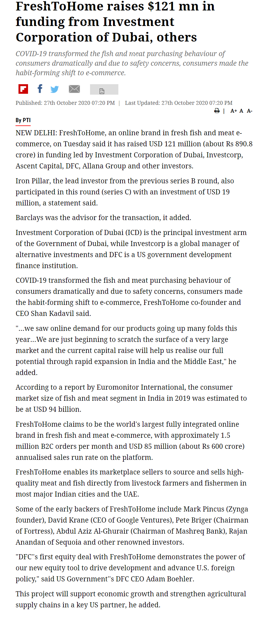 November 13, 2020 By Supriya Ghorpade NewsUncategorized FreshToHome raises $121 mn in funding from Investment Corporation of Dubai, others – The new Indian express Supriya Ghorpade November 13, 2020 source Related