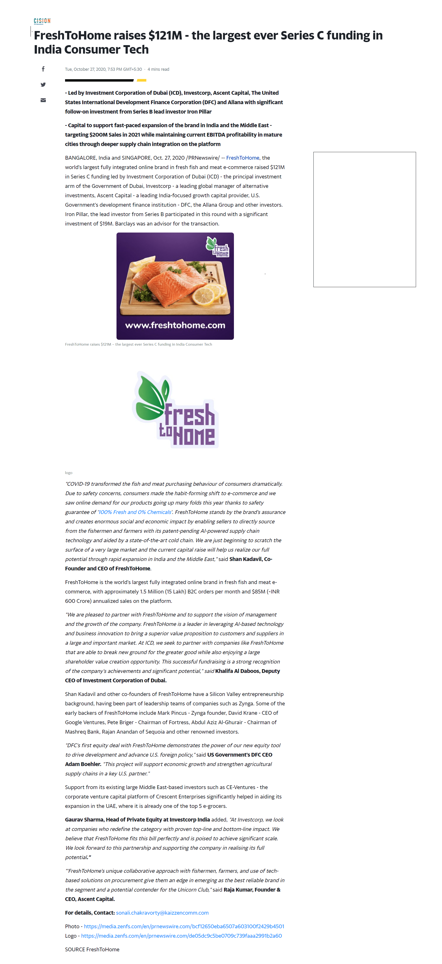 October 28, 2020 By Supriya Ghorpade News FreshToHome raises $121M – the largest ever Series C funding in India Consumer Tech- Supriya Ghorpade October 28, 2020 source Related