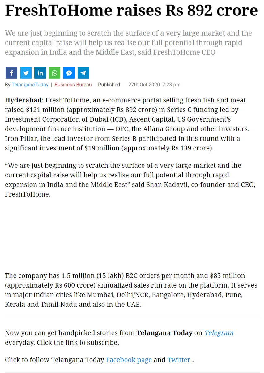 November 13, 2020 By Supriya Ghorpade News FreshToHome raises Rs 892 crore- Telangana today Supriya Ghorpade November 13, 2020 source Related