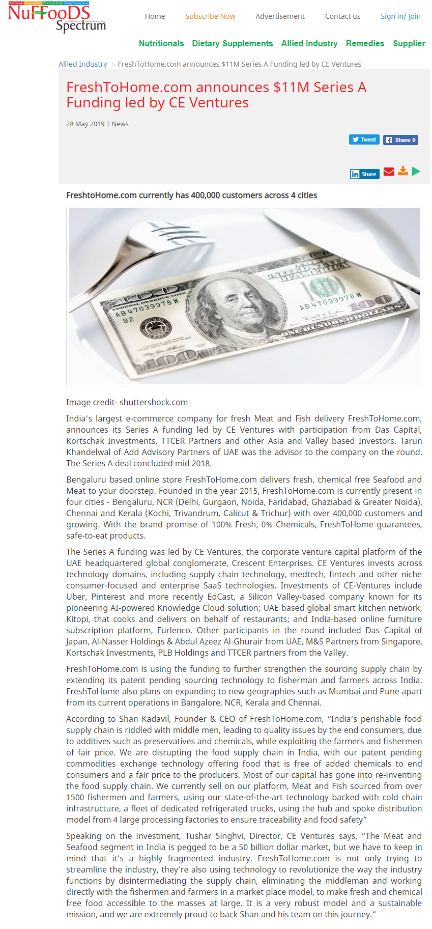 June 4, 2019 By Vaishnavi Ramanujam News FreshToHome announces $11M Series A Funding led by CE Ventures Vaishnavi Ramanujam June 4, 2019 Related capitalCE Ventureschemical freechickenfishfreshtohomefundingmeatmedianewspreservative freeseafoodseries Astartup