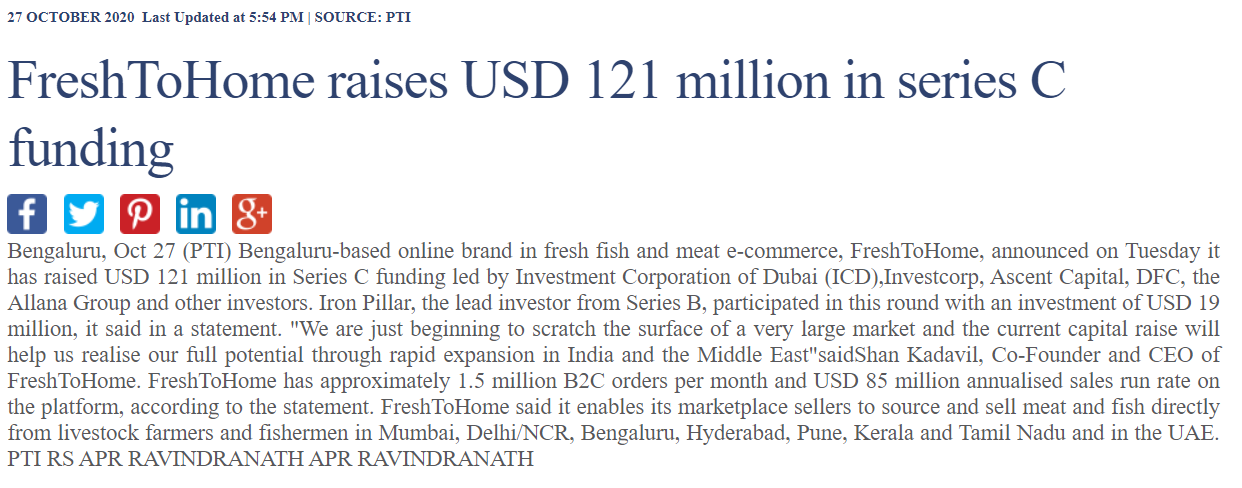 October 28, 2020 By Supriya Ghorpade News FreshToHome raises USD 121 million in series C funding Supriya Ghorpade October 28, 2020 source Related