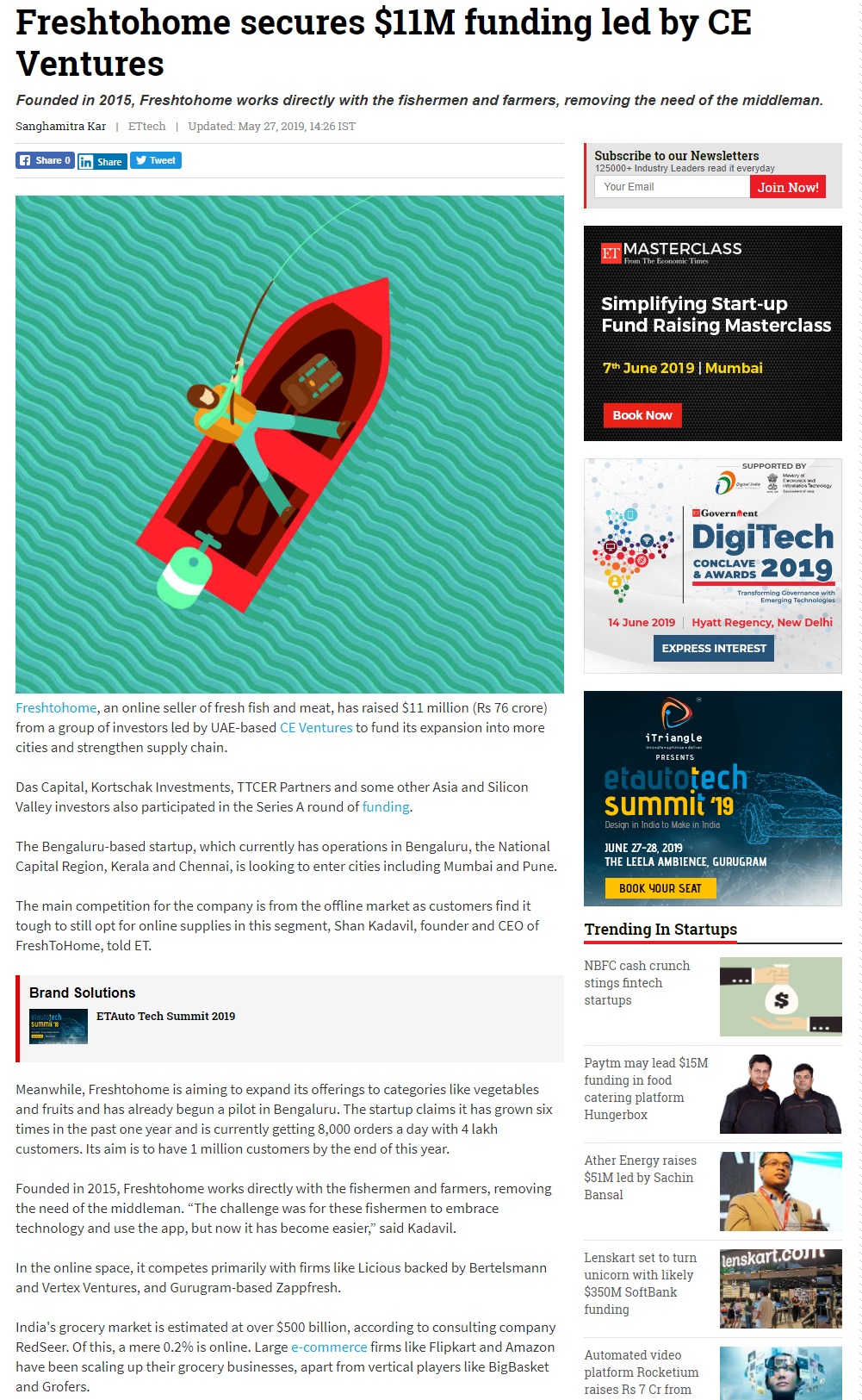 May 29, 2019 By Vaishnavi Ramanujam News Freshtohome secures $11M funding led by CE Ventures Vaishnavi Ramanujam May 29, 2019 Related chemical freefreshtohomemedianewsseries A
