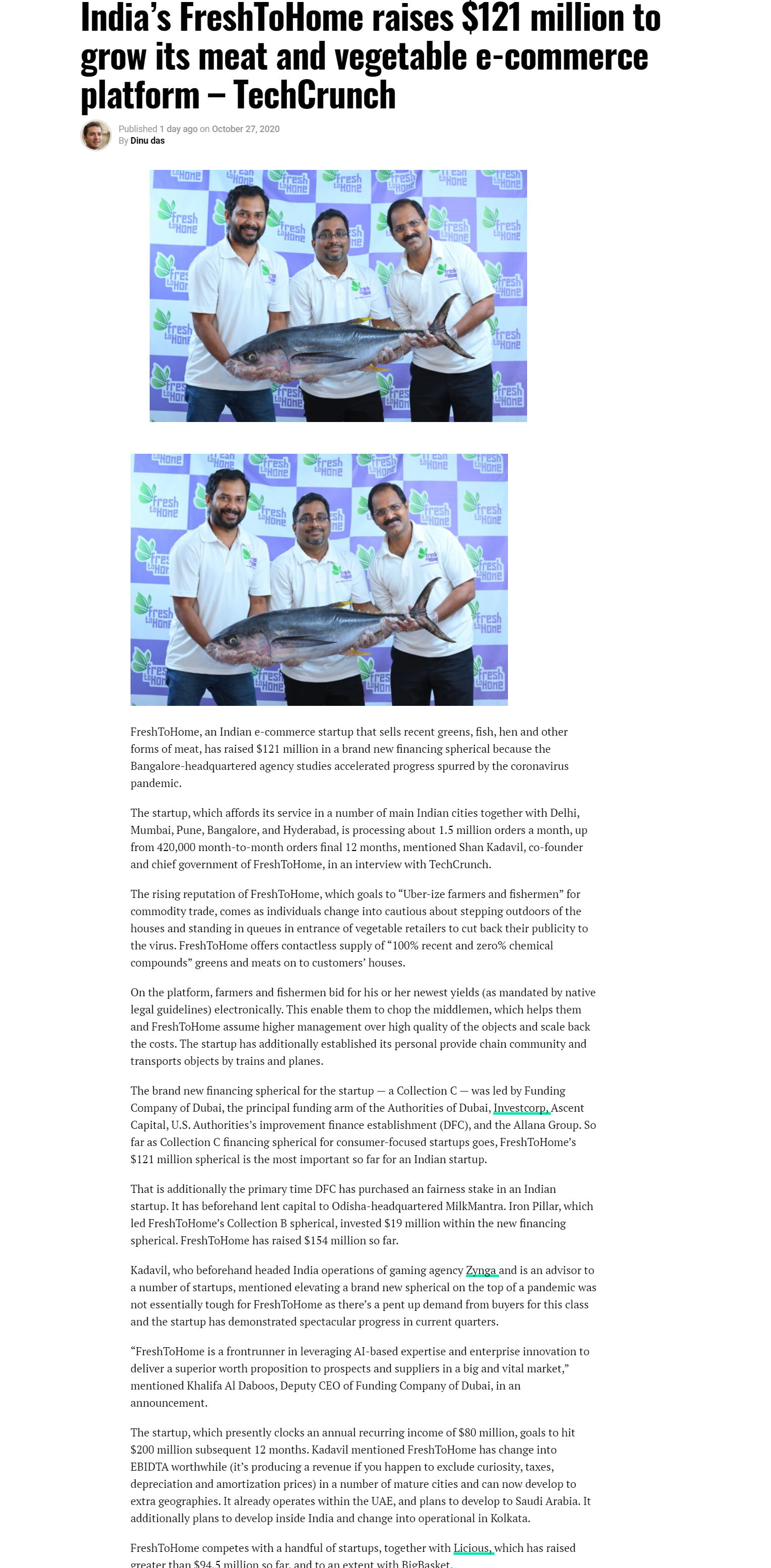 October 28, 2020 By Supriya Ghorpade News TECH NEWSIndia’s FreshToHome raises $121 million to grow its meat and vegetable e-commerce platform – TechCrunch Supriya Ghorpade October 28, 2020 source Related